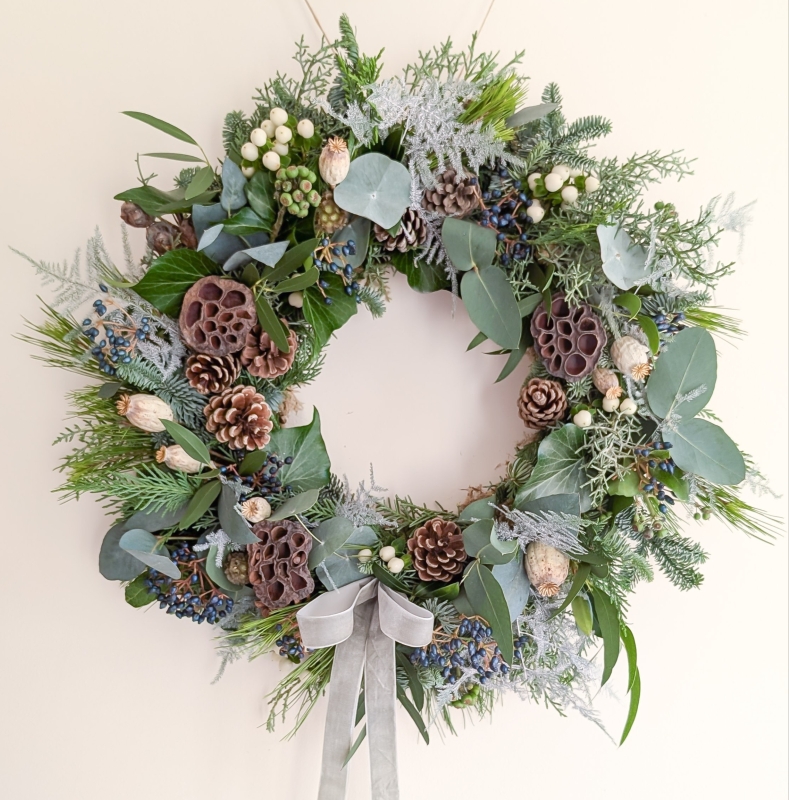 Wintery foliage complete with berries, seed pods, pine cones and lotus pods. Finished with a grey velvet ribbon. Perfect for adding those wintery feels on your front door this Christmas!