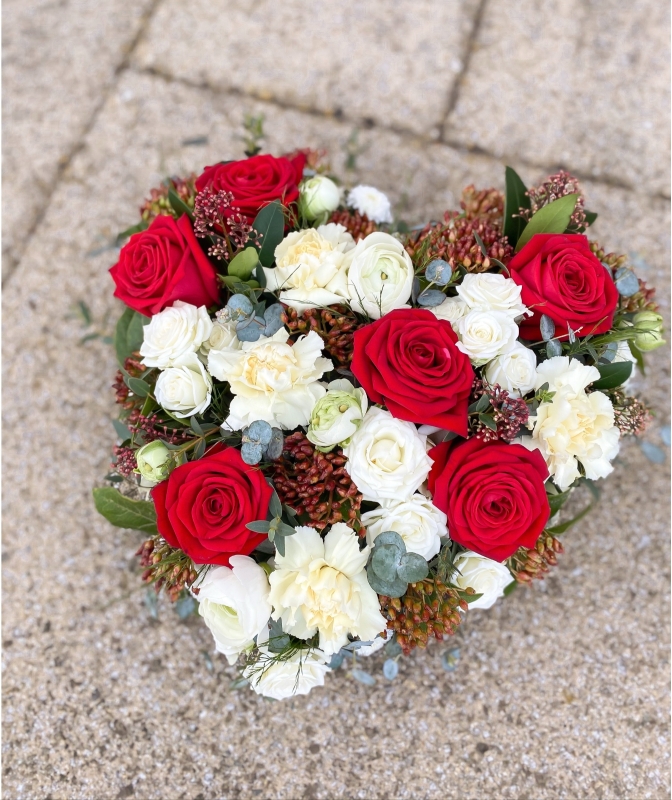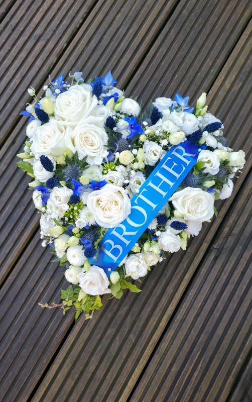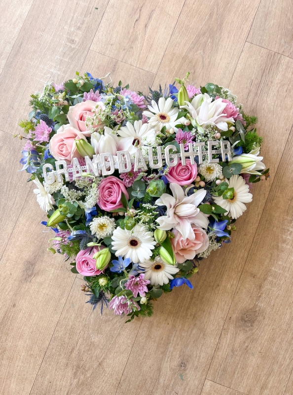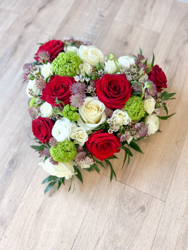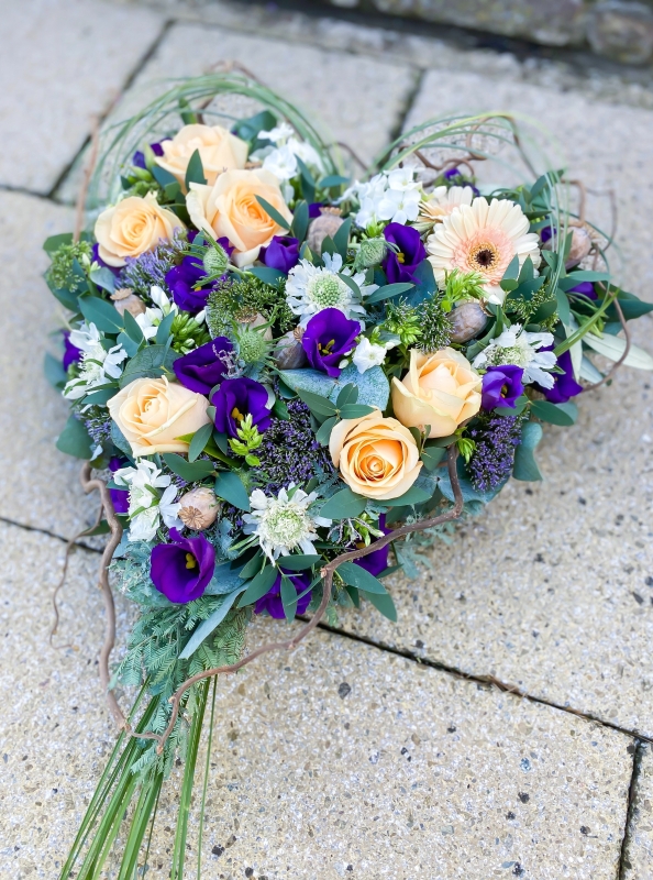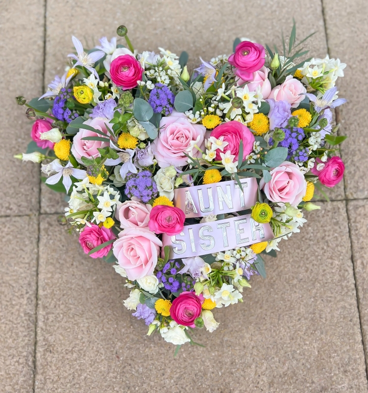 A beautiful heart tribute, containing a pretty mix of seasonal blooms in your selected colour palette with textured foliage. Please note: the flower choices in each image are a guide only. To add a ribbon name please go back into the list of tributes and add the 'ribbon lettering' option to your basket.