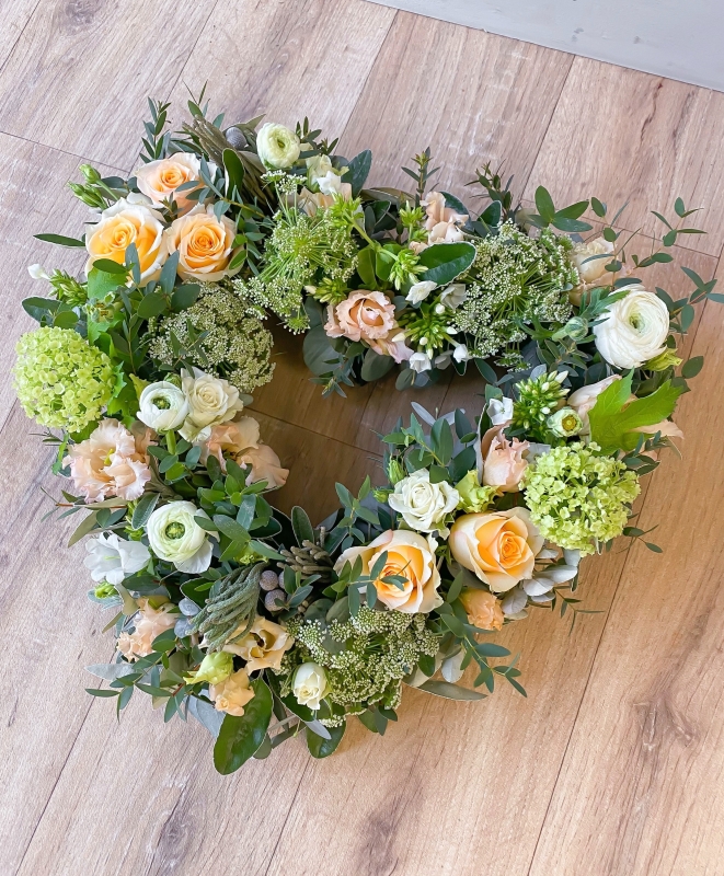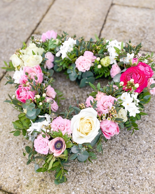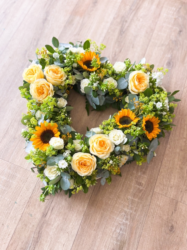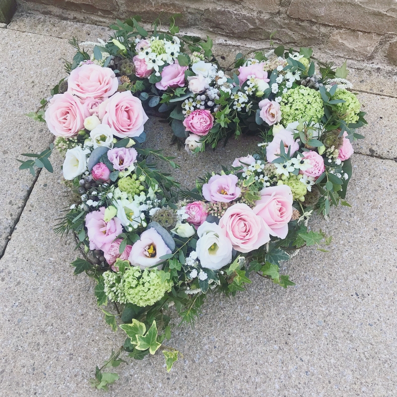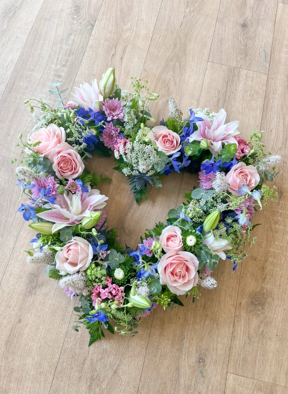 A beautiful natural open heart arrangement made in your colour choice, using a selection of the best seasonal blooms and mixed foliage. Please note: the flower choices in each image are a guide only. To add a ribbon name please go back into the list of tributes and add the 'ribbon lettering' option to your basket.