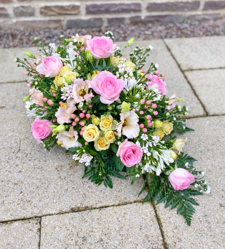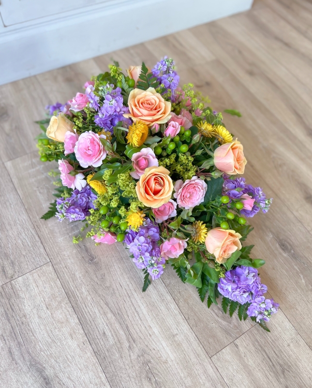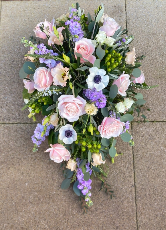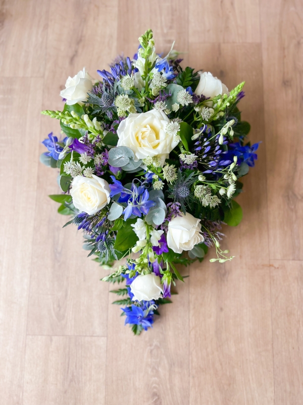 A pretty single ended spray arrangement which resembles the shape of a teardrop, made in your colour choice with beautiful seasonal blooms and mixed foliage. Please note: the flower choices in each image are a guide only.