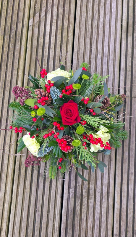 Remembering those who are no longer with us at Christmas time. Each posy is filled with a selection of long-lasting Christmas greenery including Spruce and Pine, and contains a selection of flowers and festive accents.