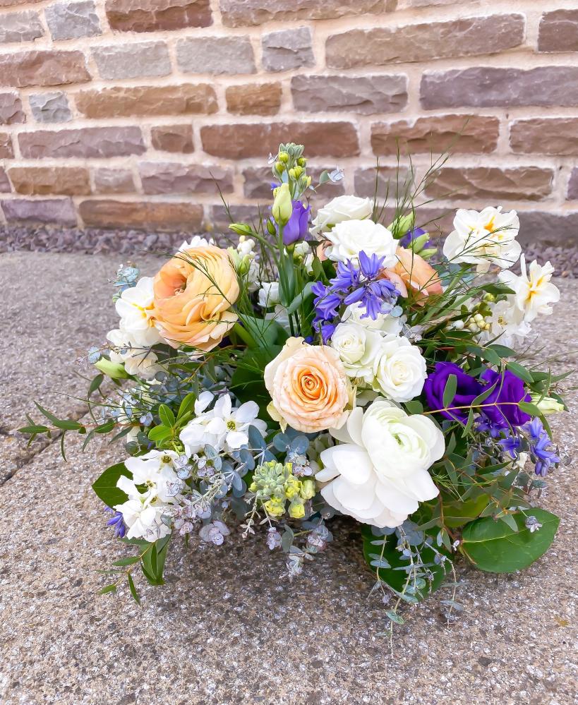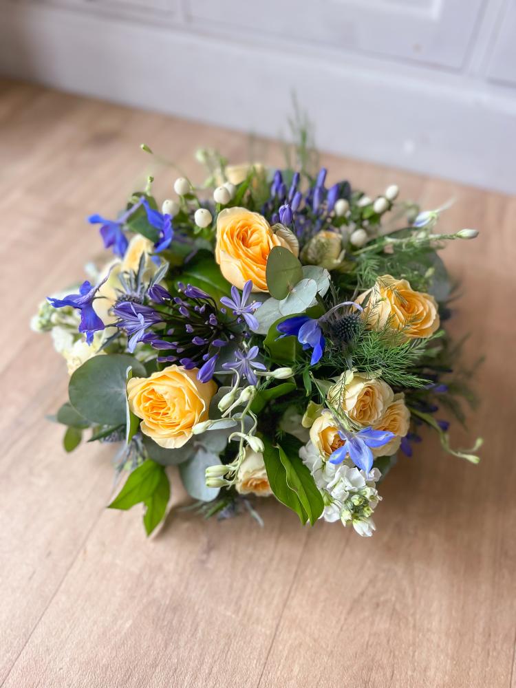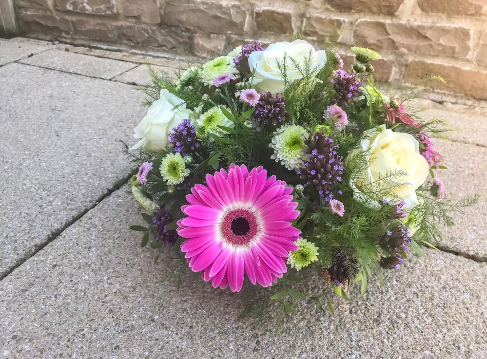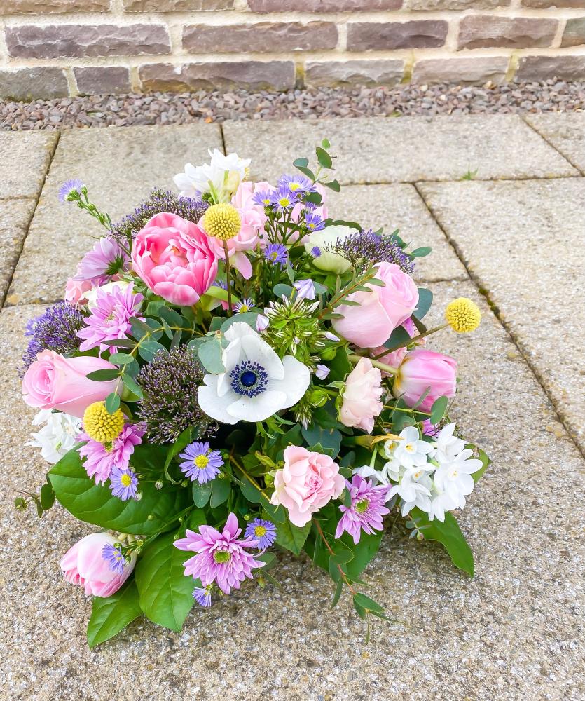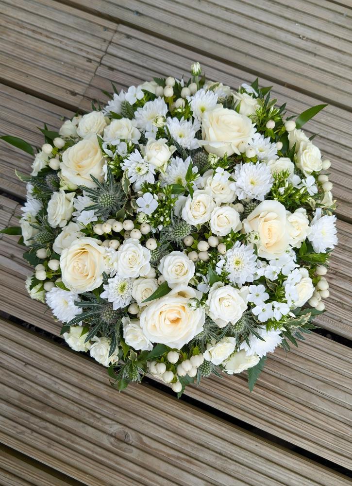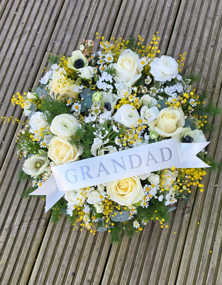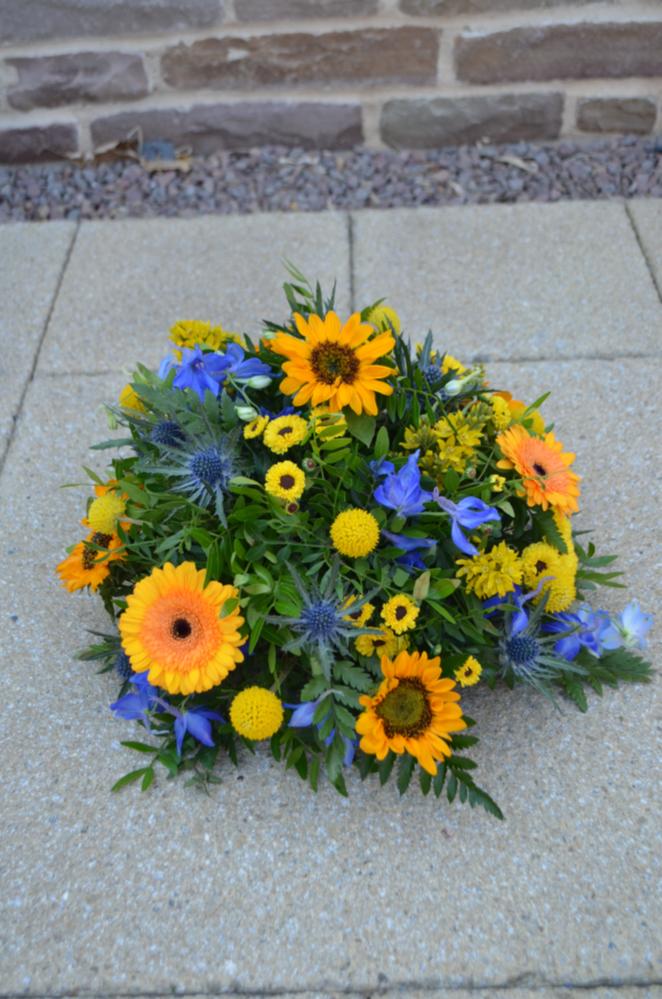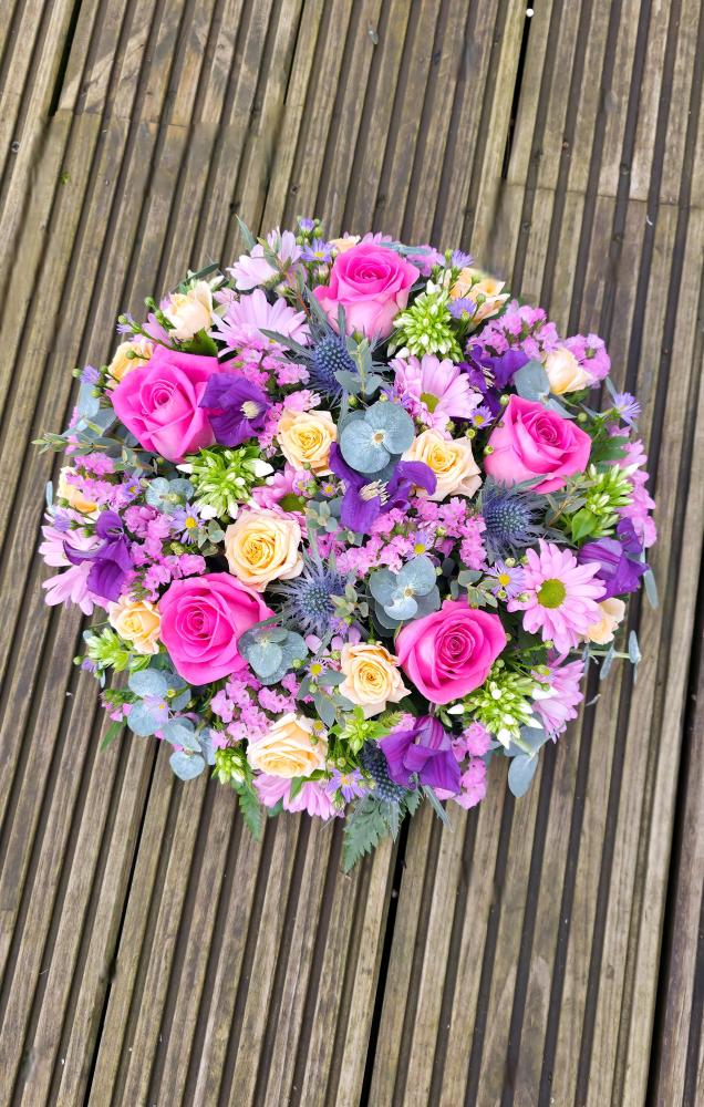 A simple round arrangement of flowers: a popular tribute often sent from the Grandchildren. These start from a 10" and go up to 16" in your chosen colours.